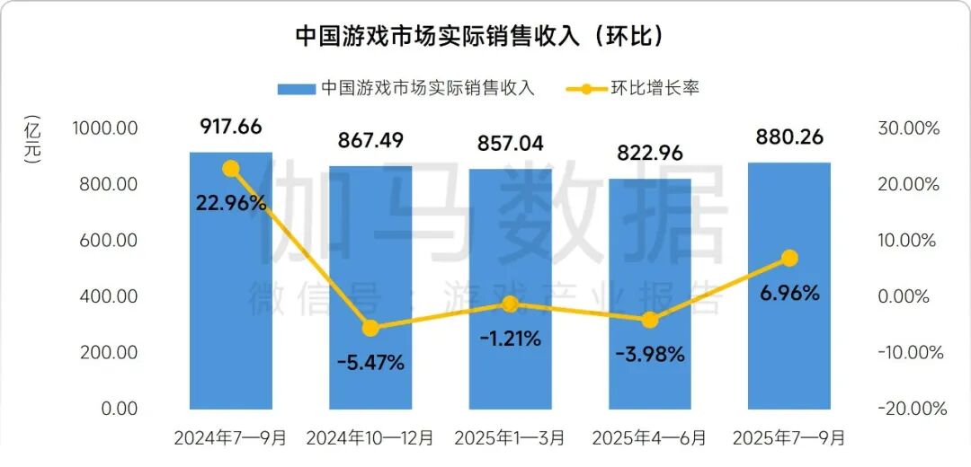 2025年7—9月,中国游戏市场实际销售收入为880.26亿元,环比增长6.96%,同比下降4.08%。