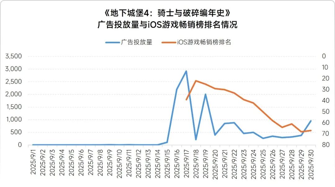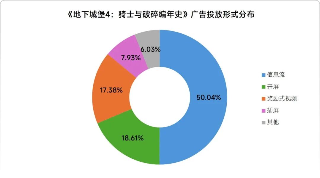 《地下城堡4:骑士与破碎编年史》于9月17日上线,广告投放量集中于上线当日,统计日期内,游戏在iOS游戏畅销榜排名最高达第22位。游戏广告投放以信息流广告为主,占比达50.04%。