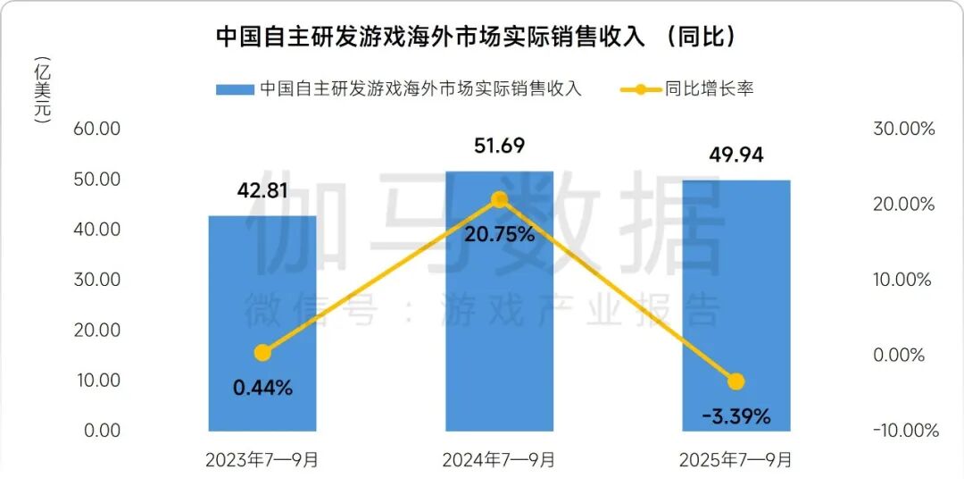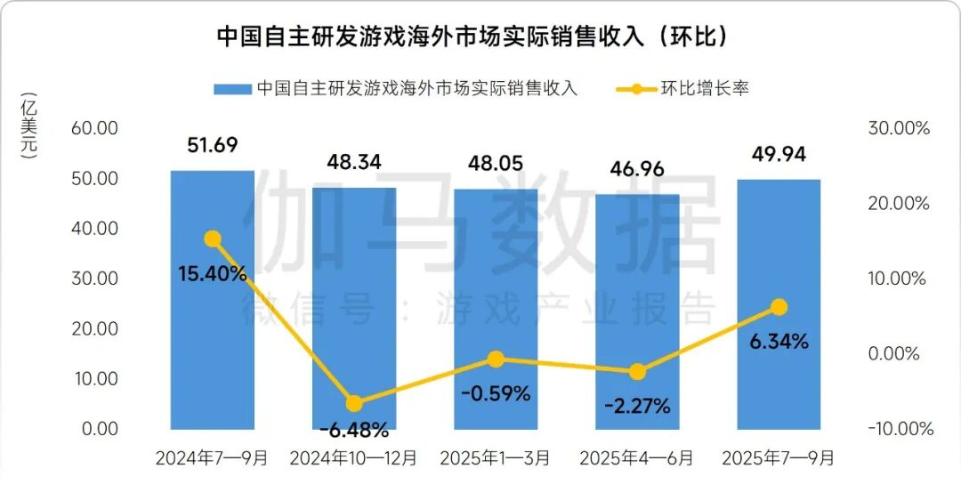 2025年7—9月,中国自主研发游戏海外市场实际销售收入为49.94亿美元,环比增长6.34%,同比下降3.39%。其中,《Kingshot》《Last Z: Survival Shooter》两款策略类出海头部产品,在市场环比增长中起到关键推动作用。