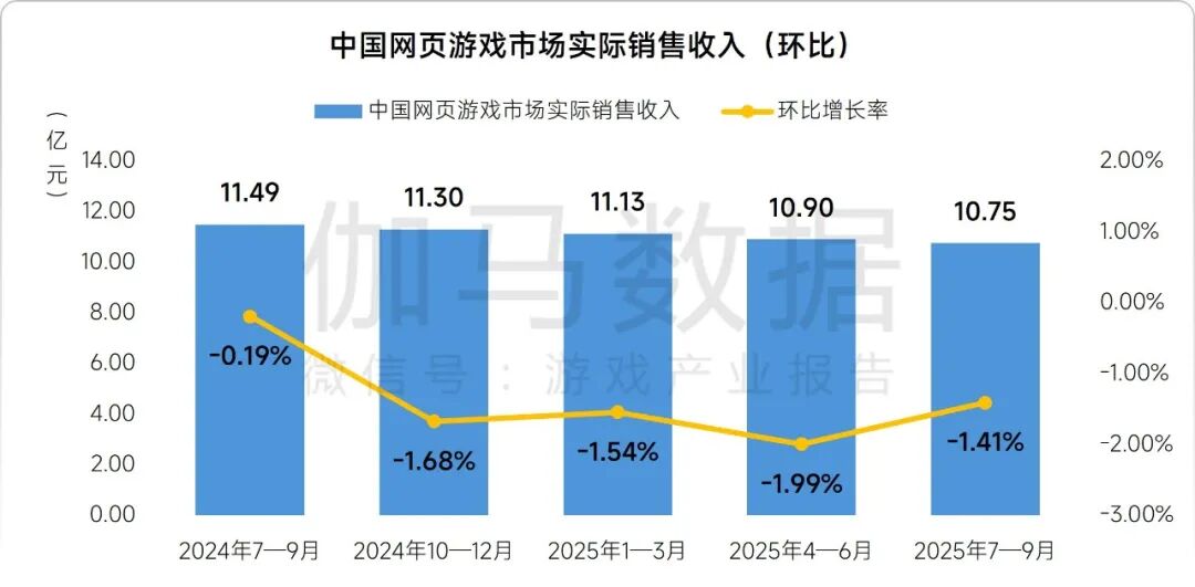 2025年7—9月,中国网页游戏市场实际销售收入为10.75亿元,环比下降1.41%。网页游戏市场的持续收缩,主要源于游戏企业战略重心的转移。在技术迭代与用户偏好变化的背景下,企业将研发与运营资源更多投向移动游戏、客户端游戏及跨端产品领域,对网页游戏的投入减少。