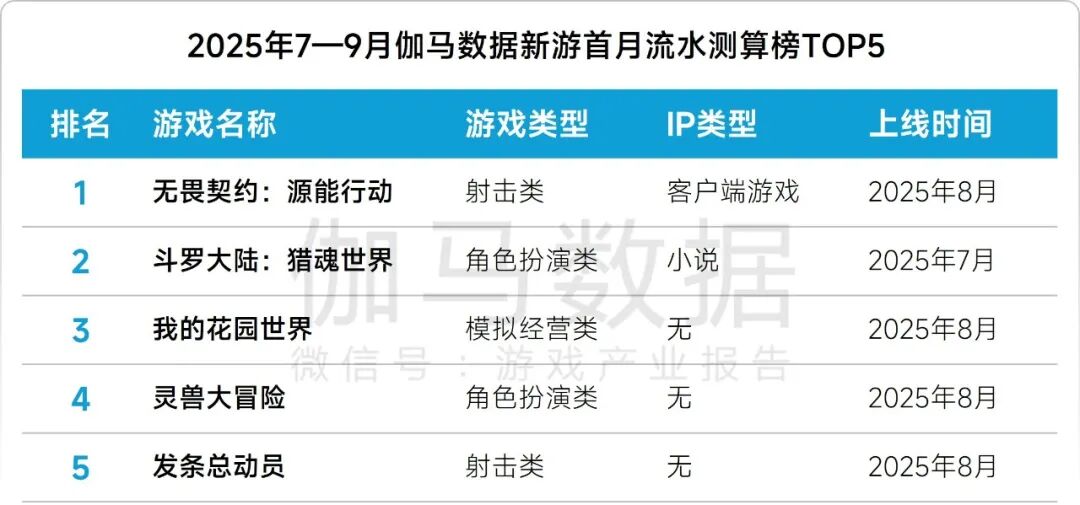 注:上述为2025年7—9月上线的移动游戏,并依据产品上线后30日国内全平台流水状况进行排名,上线不足30日的产品根据其目前流水状况推算首月流水。数据来源于伽马数据移动游戏流水测算,仅供参考。