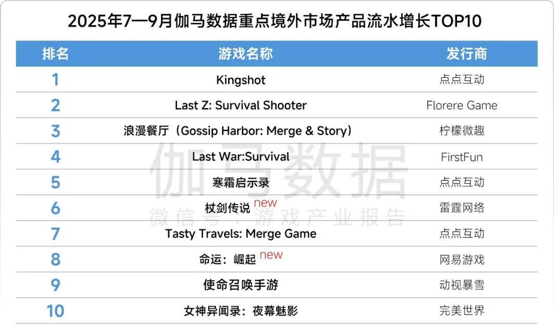 2025年7—9月重点境外市场产品流水增长TOP10中,《Kingshot》再次位列榜首,新游《杖剑传说》《命运:崛起》入榜。