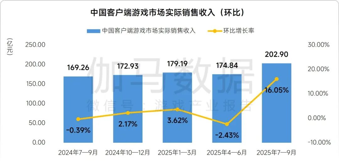 2025年7—9月,中国客户端游戏市场实际销售收入为202.9亿元,环比增长16.05%,同比增长19.88%。经典IP的成熟期产品与新品供给共同推动市场增长。