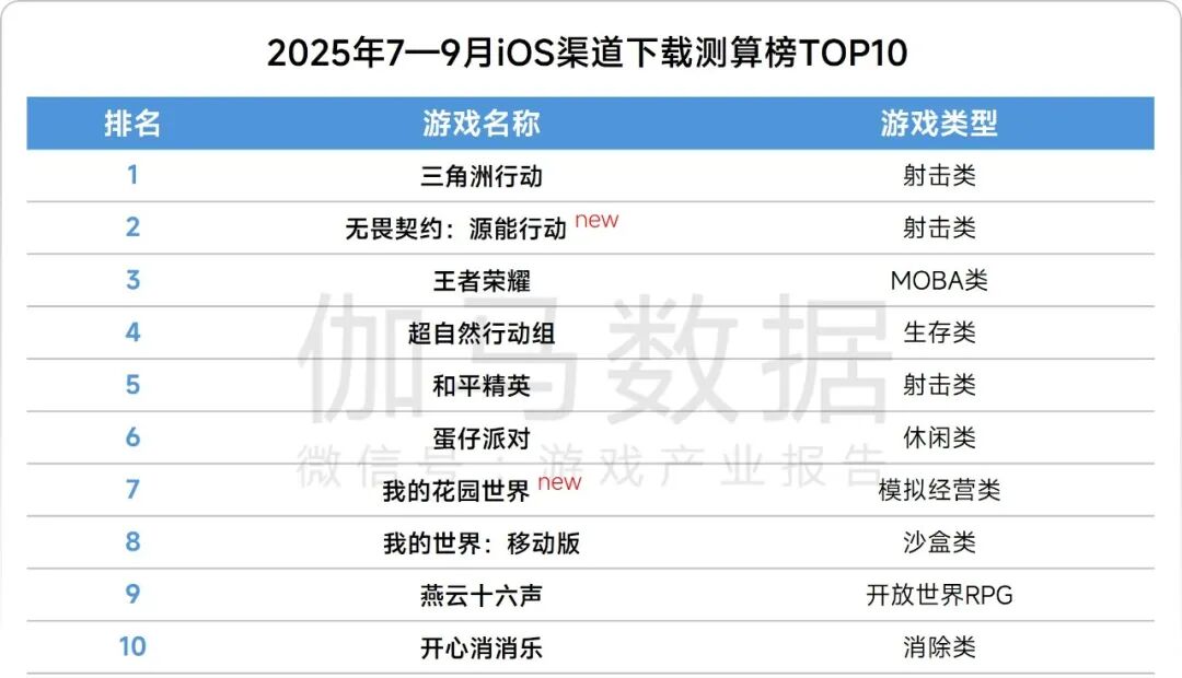 2025年7—9月,在iOS渠道下载测算榜TOP10中,新品与长线产品均有入榜。射击类产品数量占据优势,《三角洲行动》《无畏契约:源能行动》《和平精英》三款射击游戏同时入榜,其中《无畏契约:源能行动》作为新品凭借其IP影响力与竞技玩法快速吸引用户;而《和平精英》则代表了长线射击游戏的持续吸引力。此外,模拟经营类新品《我的花园世界》以其休闲治愈的题材,满足了市场另一部分用户的需求。
